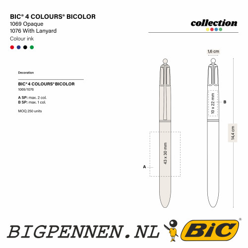 De pen bestaat uit 2 delen (houder en dop). De BIC® 4 Colours balpen heeft standaard 4 kleuren inkt: rood, blauw, zwart en groen. BIC® 4 Colours met Lanyard op aanvraag.