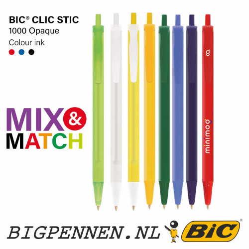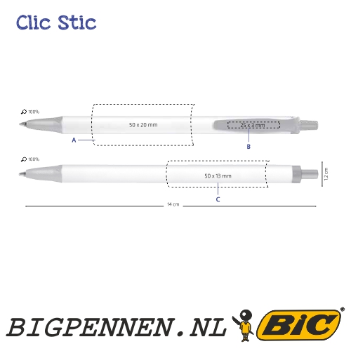 Wij bedrukken de BIC® Clic Stic balpennen in de fabrieken van BIC® in Spanje. De bedrukking is mogelijk: