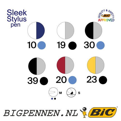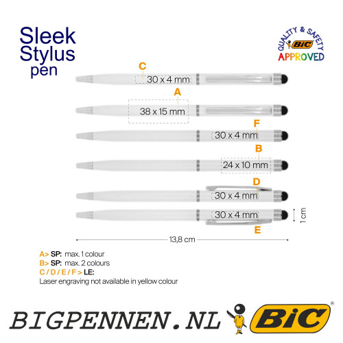 Sleek Stylus pen approved by BIC® incl. opdruk met logo, naam of tekst. Deze Sleek Stylus pen is goedgekeurd door BIC®. De pen heeft een mooi design en is van goede kwaliteit met veel schrijfplezier voor jong en oud. Kleine afname mogelijk, met snelle levertijden.